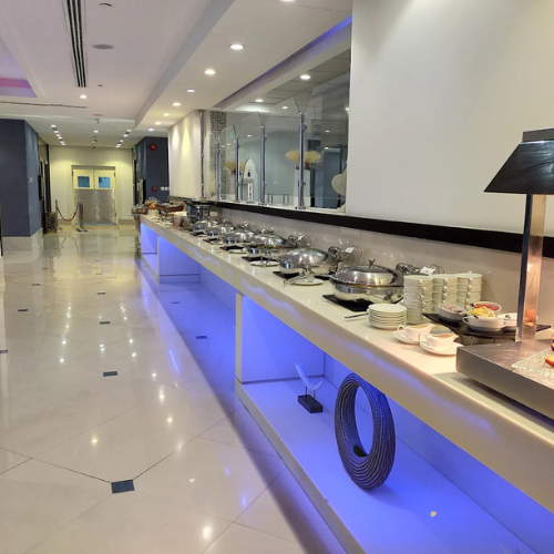 The hotel’s on-site restaurant serves a wide variety of cuisines, including Middle Eastern, seafood, and barbecue grill, with breakfast options ranging from continental and buffet to Italian. Fresh pastries, warm dishes, local specialties, pancakes, cheese, and fruits ensure a satisfying start to the day.